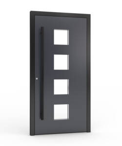 Ytterdörren levereras som standard med en exklusiv helaluminiumtröskel med integrerad köldbrygga. Den kombinerar mycket god värmeisolering med hög slitstyrka och är utvecklad för moderna, energieffektiva bostäder där kvalitet, funktion och design samverkar på premium­nivå.