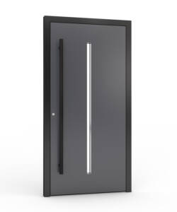 Ytterdörren levereras som standard med en exklusiv helaluminiumtröskel med integrerad köldbrygga. Den kombinerar mycket god värmeisolering med hög slitstyrka och är utvecklad för moderna, energieffektiva bostäder där kvalitet, funktion och design samverkar på premium­nivå.